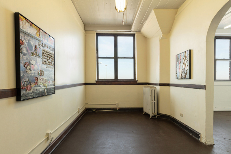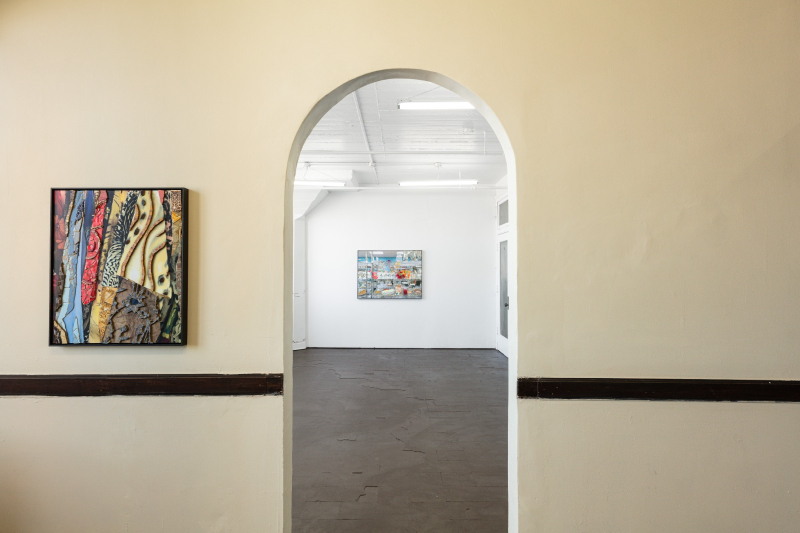 With the installation, the artist has built an arched threshold between two rooms that fluctuate between warm and cool fluorescent lighting, casting a subtle atmospheric imbalance that further emphasizes this dislocation